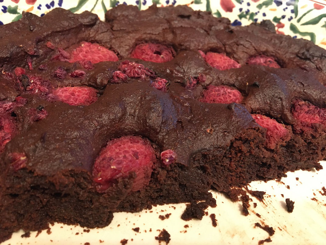 Hier unsere beliebten Himbeer-Brownies, die schneller aufgegessen sind, als sie abkühlen können (inspiriert von Mrs. Flury, verändert von mir):