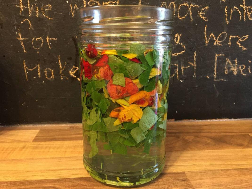 For the indian cress essence cut blossoms and leaves of the plant and fill it up to two thirds of a jar. Fill in alcohol 40-50% (neutral in taste) until the plants are covered and close with a lid.