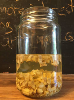 Für die Liebstöckelwurzel-Essenz die Wurzel des Liebstöckels ausgraben, gründlich reinigen, in kleine Stücke schneiden und in ein Gefäß füllen. Da sich die Inhaltsstoffe aus Wurzeln schwerer lösen als aus Blättern, verwende ich einen 96%igen Alkohol aus der Apotheke. Ich gebe vom Volumen her doppelt soviel Alkohol als Wurzel ins Gefäß.